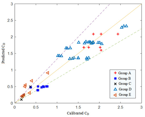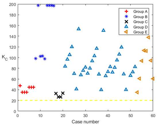 Keulegan–Carpenter number, , for all 60 experimental cases summarized in Table 1 with the dashed line indicating the threshold value . Group A: Huang et al. [29]. Group B: Koftis et al. [30]. Group C: Dubi and Tørum [31]. Group D: Anderson et al. [32]. Group E: Sánchez-González, Sánchez-Rojas and Memos [33]. See Table 1 for the experimental conditions of each group.