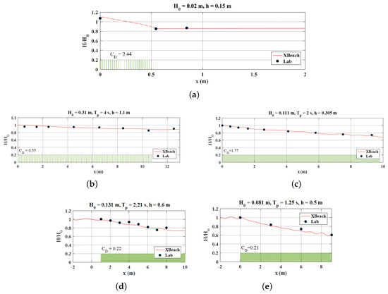 Examples of the normalized wave height across the model vegetation for the experiments listed in Table 1. (a) Huang et al. [29]. (b) Koftis et al. [30]. (c) Anderson et al. [32]. (d) Dubi and Tørum [31]. (e) Sánchez-González, Sánchez-Rojas and Memos [33]. Symbol: measurements. Line: numerical results. Vertical bars at the bottom are plotted to indicate the location of the vegetation patch and do not reflect the real stem heights.