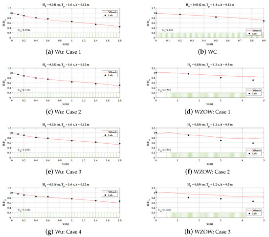 Normalized wave height across the model vegetation for all 8 cases listed in Table 2. (a) Case 1 of Wu [36]. (b) Wu and Cox [37]. (c) Case 2 of Wu [36]. (d) Case 1 of Wu et al. [12]. (e) Case 3 of Wu [36]. (f) Case 2 of Wu et al. [12]. (g) Case 4 of Wu [36]. (h) Case 3 of Wu et al. [12]. Symbol: measurements. Line: numerical results with the of CD calculated explicitly by (6). Vertical bars at the bottom are plotted to indicate the location of the vegetation patch and do not reflect the real stem heights. See Table 2 for the detailed experimental conditions.