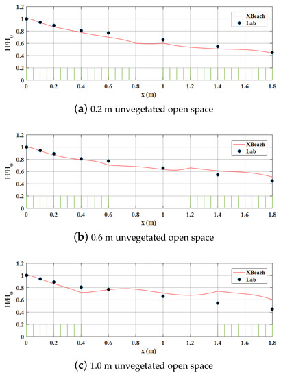 In some situations, a single strip of vegetation bed can be cut by the flow and becomes several isolated vegetated patches. Intuitively, this may decrease the wave attenuation by vegetation. To investigate the effect of this type of discontinuity on wave damping, we design a simple numerical experiment by replacing a whole vegetation bed with two smaller patches at both ends and a unvegetated open space in the middle. Our scenario study is presented in Figure 12. The case demonstrated in Figure 11a, which has a unconnected vegetated strip of 1.8 m in width, is used as the baseline to be compared with three designed cases with a central opening of 0.2 m (11%), 0.6 m (33%), and 1.0 m (55%), respectively. Figure 12 shows that, as expected, when the opening is only 0.2 m the wave height at the exit of the whole vegetated bed is barely changed. However, when the open space increases to 55% of the entire vegetated bed, the wave height at the exit increases roughly by 30% (see Figure 12c). As for the case with 33% opening, Figure 12b shows that the exit wave height increases only around 10%, which is nice. This suggests that, as far as the exit wave height is considered, it is unnecessary for the plants to cover the entire width of the designed vegetated strip. In view of the practical engineering design for a green belt protection, this implies that some of the initial tree-planting expenses and the follow-up operation and maintenance costs can potentially be saved.