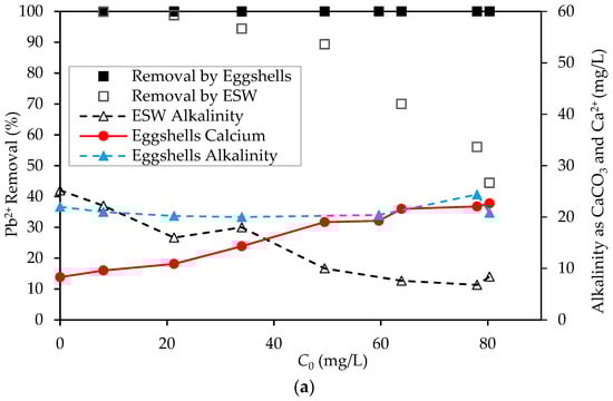 To study the removal of Pb2+ by precipitation, the method outlined in Section 2.7 was followed. The percentage of Pb2+ removal as a function of the initial Pb2+ in solution (C0) is presented in Figure 8. The figure compares the total Pb2+ removal obtained when eggshells were physically in solution and Pb2+ removal due to precipitation with eggshell water (ESW). Clearly, precipitation plays a major role in the removal of Pb2+ by eggshells. At a low initial concentration, Pb2+ removal could entirely be attributed to precipitation due to the presence of carbonates in the solution. However, the role of precipitation is reduced as the s/w ratio and initial concentration of Pb2+ become higher (Figure 8a). The difference between the removal in the two cases (eggshells and ESW) could be attributed to sorption. However, it was observed that aqueous Ca2+ in equilibrium with eggshells increased with the increase in initial Pb2+ concentration, while alkalinity remained almost constant (Figure 8a). The level of Ca2+, in the case of ESW, remained the same at 8.3 and 7.5 mg/L for s/w ratios 1:200 and 1:2000, respectively, at all initial Pb2+ concentrations. Thus, comparison between Pb2+ removal with ESW versus that of eggshells may provide an underestimation of the extent of precipitation. Further, the increase in Ca2+ in the presence of eggshells was more pronounced at the high s/w ratio (Figure 8a) compared to that for the low s/w ratio (Figure 8b). Such a finding was accompanied by an almost constant alkalinity due to the continuous release of carbonates by eggshells. This could explain the higher difference between the removal of Pb2+ by eggshells and ESW at the high s/w ratio (Figure 8a).