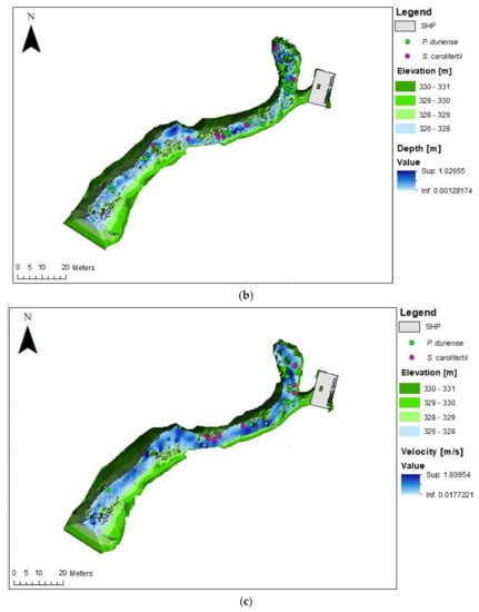 Boxplots of habitat use (i.e., depth and velocity) for P. duriense and S. carolitertii in the two different occasions—HP and NHP—are shown in Figure 5.