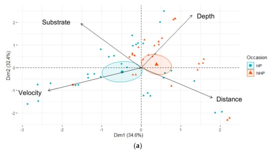 Principal component analysis (PCA) for (a) P. duriense and (b) S. carolitertii for the environmental variables: velocity, distance (to the SHP tailrace), substrate, and depth. Ellipses (confidence level = 0.95) are graphical representations of the samples at HP and NHP.
