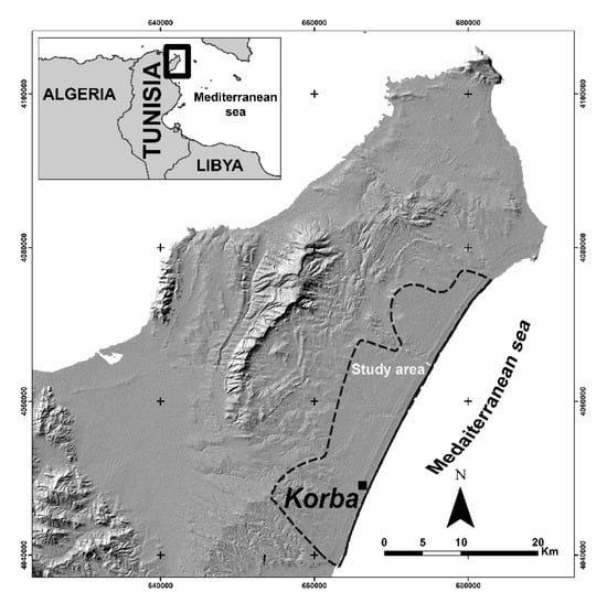Location map of Tunisia and the Korba region located in the Cap-Bon Peninsula (projection system: TUN UTM; datum: WGS_1984; zone: 32).
