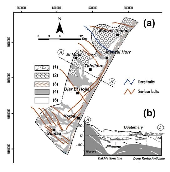 (a) Geologic and structures map of the Korba aquifer: ((1) Miocene sands, (2) Pliocene sands, (3) Tyrrhenian sandstones, (4) Quaternary alluvial deposits, (5) Marine Quaternary) and (b) Schematic cross section of the aquifer showing the subsurface hydro-geological and groundwater flow movements [2].