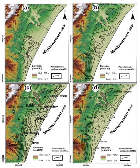 Potentiometric map evolution of the Korba aquifer: (a) 1965 [10]; (b) 1977 [10]; (c) 2014 [8] and (d) 2018 (Chiba, M’Laabi and Lebna dams were built in 1963, 1964 and 1986, respectively).