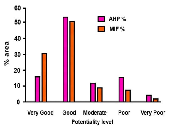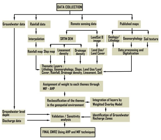MIF is a widely used MCDM technique for environmental management [12,34,36]. The method is useful for mapping groundwater recharge sites by assigning an appropriate weight to various factors and feature classes based on the influence on groundwater flow and storage (Figure 5).