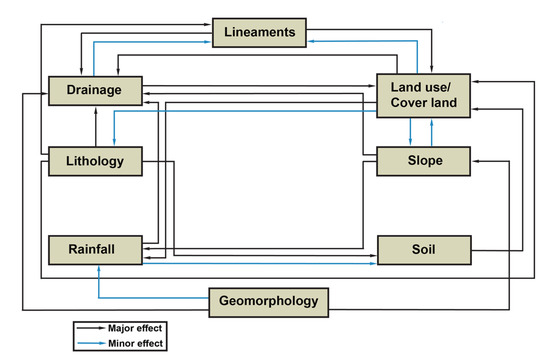 The ranks and weights are assigned to each factor and different classes based on their relative contribution to groundwater recharge. We specified major and minor influential relationships among the factors (Figure 5). Each relationship was weighted according to its influence on recharge. A large weight indicates that the factor has a large influence on groundwater recharge. The representative weight of a factor influencing recharge potential is the sum of all weights from each factor. Major effects were assigned a weight of 1.0 whereas minor influential relationships were given a weight of 0.5 [55,56,57]. Furthermore, the classes with no effect on groundwater recharge were assigned a weight of zero. The weights for each factor were summed to obtain the recharge potential factor weight [34,35]. The estimated weight for each influencing factor was obtained as a percentage using Equation (9):