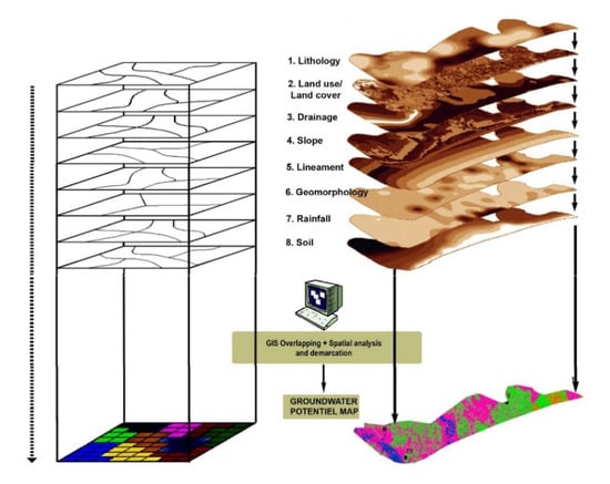 A schematic of thematic layer overlay analysis using geographic information system (GIS) to demarcate groundwater recharge potential zones.