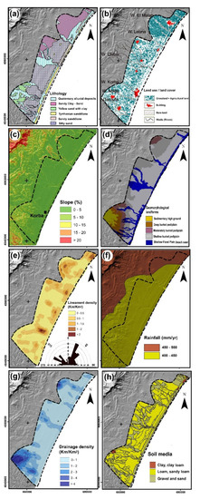 Delineation of groundwater recharge zones (GWRZ) is essential for planning artificial recharge programs to mitigate groundwater decline [12,13,14,15]. Groundwater recharge is affected by human activities and natural possesses on the ground surface and within the aquifer system. Many factors affect the occurrence and movement of groundwater in a region, including rainfall, lineament density, slope, drainage density, land use/land cover, lithology, geomorphology and soil types [12,14,16,17,18,19].