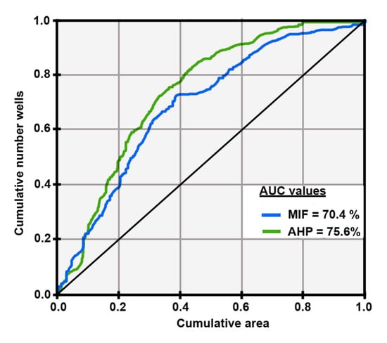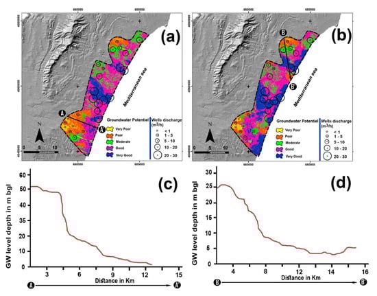 The ROC curve was applied as a mathematical technique to determine the map accuracy [78,80,81]. Using SPSS-statistical software, ROC curves were obtained by considering cumulative percentage of area (on the x axis) and the cumulative percentage of number of wells (on the y axis) [84]. The area under the curve (AUC) was calculated to quantify the ability to predict the occurrence or non-occurrence of pre-defined ‘‘events’’ [83,84,85,86]. The resultant AUC values range from 0.5 (i.e., a random prediction) to 1 (i.e., an excellent prediction) [81]. The quantitative–qualitative relationship between the AUC value and prediction accuracy can be excellent (0.9–1), very good (0.8–0.9), good (0.7–0.8), average (0.6–0.7) and poor (0.5–0.6) [85]. To illustrate the extent to which the occurrence or non-occurrence of pre-defined events was correctly predicted, the AUC method was verified through frequency percentage for AHP and MIF techniques. A comparative study was carried out between the water level profile and groundwater recharge zones through two water level profiles for two sections in the study area AA’ and BB’ (see Figure 8), for AHP and MIF methods, respectively.