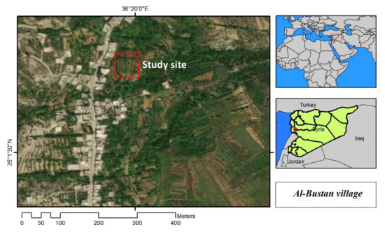 The study area is located in Al-Bustan village (36.329 E, 35.016 N) in Hamah Governorate (Syria) (Figure 1), NE Syria, and it is about 720 m above sea level. Generally, soils in this area are described as clayey soils (sand 9.8%; silt 21.9%; clay 68.3%), slight alkaline (pH = 8.1), non-saline (electrical conductivity (EC)= 0.15 dS/m), have moderate organic matter content (OM% = 1.9%), and high in calcium carbonate content (41.3%). Physical characteristics, such as bulk density (1.3 g/cm3), practical density (2.62 g/cm3), and porosity (49.61%) indicated a compacting soil condition. The study area is dominated by dolomitic rocks alternating with limestone, dating back to the middle and upper Jurassic, and has a maximum thickness of about 700 m. The climate of this region is characterized by hot summers and cold and rainy winters, with an average precipitation of 1890 mm. Olives cultivations dominate the land use, with smaller patches of Pinus forests as natural vegetation.