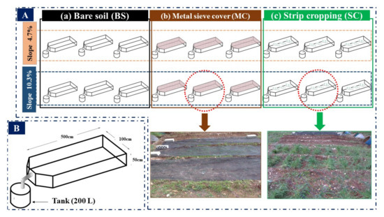 (A) Field experimental design in two different slope inclination (4.7%, 10.3%), (a) nine plots of bare soil (BS), (b) nine plots of metal sieve cover (MC), and (c) nine plots of strip cropping (SC). (B) sketch of experimental plot (500 cm × 100 cm × 50 cm).