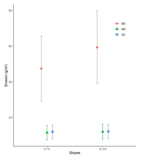 Soil erosion rates varied by the soil cover with significant effect (df = 2, F = 8.503, p < 0.001). In particular, erosion values at BS plots were significantly higher than at MC and SC plots as reflected by the p-values (Table 2). Furthermore, non-significant difference has been detected between erosion measured at MC and SC plots. Moreover, BS error values had the largest variance whereas MC and SC plots mean erosion values and standard errors were low (Figure 3). Considering the inclination, the difference between soil erosion in slopes characterized by 4.7% and 10.3% of steepness was not significant (mean difference = 21, df = 1, F = 0.197, p = 0.659).