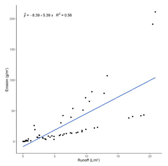 A scatter plot indicating the relationship between erosion (g/m2) rate and runoff (L/m2).