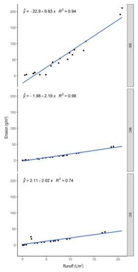 Relationship between erosion rate (g/m2) and runoff (L/m2) by soil cover types (BS: bare soil, MC: metal sieve cover, and SC: strip cropping).