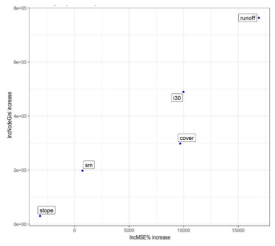 The single RFR model explained 75.9% of variance, and the variable importance indicated the runoff rate and the soil cover as the most important variables. Considering the %IncMSE, the importance values indicated the same as the second GLM model involving only the runoff and soil cover (Table 4): runoff had larger importance value than the soil cover. As RF models are not sensitive to multicollinearity, in this model we included the rain intensity, too. However, despite the strong correlation of the rain intensity with the runoff, its importance was the two-third of the runoff. Soil cover types had a relevant effect, according to the IncMSE%. Nonetheless, soil moisture (sm) and slope angle had negligible effect (Figure 6).