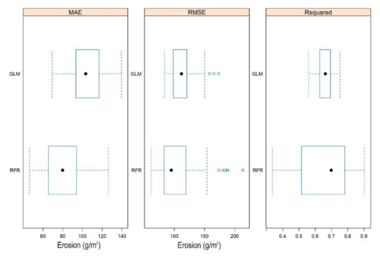 Range of the 50 models applied with the 2-fold cross-validation repeated 25 times (•: median; box: interquartile range; dashed line: 1.5 times interquartile range; ◦: outlier; MAE: mean absolute error, and RMSE: root mean square error; GLM: general linear model, RFR: random forest regression).