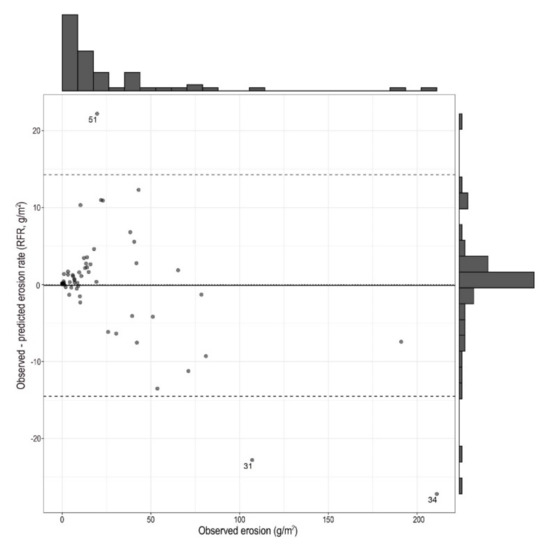 Model validation is a serious part of the erosion analysis which has an extensive literature [45,46,47], even when the results are based on field experiments, the reliability of the conclusions should be investigated [48]. Statistical analysis can reveal the general relationships, but the main question is: how do the data represent the area and the phenomenon itself? Regression analysis provides a reliable measure with goodness-of-fit indices (e.g., R2 and residual errors), but these are calculated from the dataset itself, and not from independent data. However, splitting the dataset into two parts may be misleading: a random selection can provide different datasets from the aspect of representativity, i.e., the train and test data can be selected to be appropriately different and similar, providing a randomly accurate or inaccurate outcome. A reliable method can split the datasets into several subsets, using one part to train the statistical models, and the other for testing. Moreover, we can repeat this procedure; thus, based on several random selections and repetitions can provide a basis to judge the models with higher reliability: medians, quartiles, means, standard deviations (SD) can be calculated from even hundreds of models runs. Accordingly, the accuracy, and the representativeness of the input data will be reflected in the range of model indices.