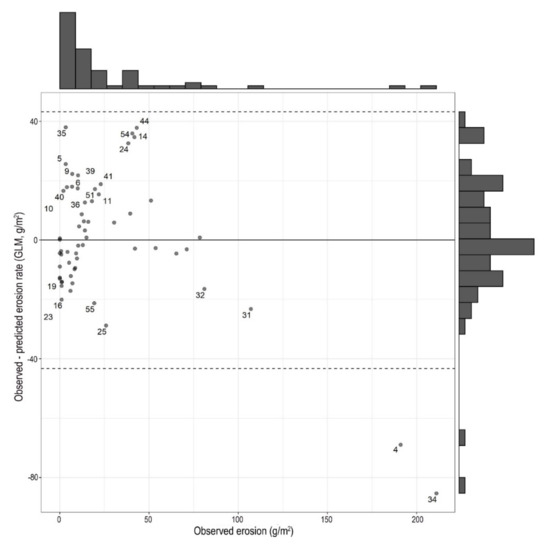 Importance of the involved predictors of erosion were similar in both models: runoff was the most important and the rain intensity (i30) was the next variable. Although i30 was in high correlation (r = 0.95, p < 0.001) with the runoff, the importance of runoff was higher in the RFR model (due to avoid multicollinearity we omitted i30 from the GLM). Soil cover was also important, but, in this research, soil moisture and the slope type (i.e., 4.7% or 10.3%) was not relevant. The relevance of soil moisture and slope angle were reported in several studies [108,109,110], but slopes were usually steeper (larger than 10°) and the difference was also ~10° among the different slope types. Moreover, smaller importance can be attributed to the local characteristics: other influencing factors, such as i30 and runoff in the combination of three types of soil cover proved to be more important than the slopes. We repeated the RFR model without the runoff variable to filter out its large effect, but the rank and the magnitude remained the same for the other variables, and the relevance of slope and soil moisture did not increase.