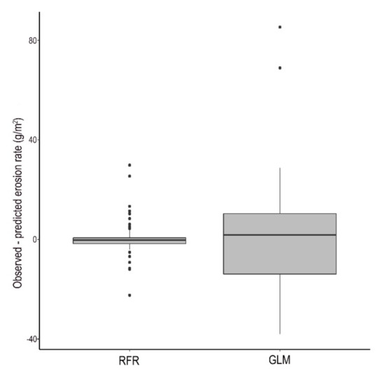 Differences of observed and modelled erosion by random forest regression (RFR) and general linear model (GLM).