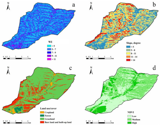 | Topographic wetness index (WI) | WI = ln (Ac/tanS), Ac is the potential contributing area [33] |