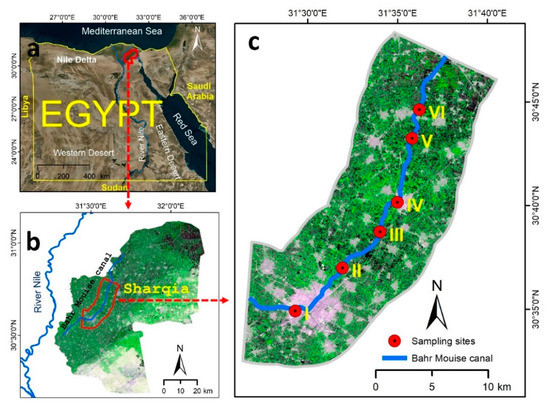 - Ramadan, E.M.; Fahmy, M.R.; Nosair, A.M.; Badr, A.M. Using geographic information system (GIS) modeling in evaluation of canals water quality in Sharkia Governorate, East Nile Delta, Egypt. Model. Earth Syst. Environ. 2019, 5, 1925–1939. [Google Scholar] [CrossRef]