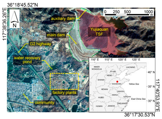 Aerial image of the research area, its location in China (insert), Yujiaquan tailings storage facility (TSF), and the downstream important facilities.