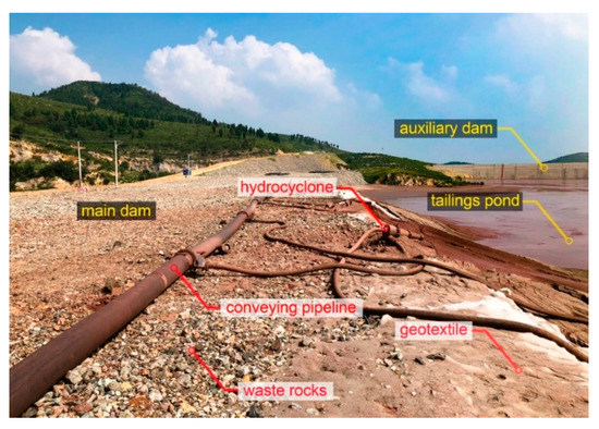 The study site of the Yujiaquan TSF is situated in Laiwu city, Shandong Province of Eastern China, as Figure 2 shows. The TSF has been operating since 1985 in order to store mining waste from the Luzhong iron mine. It was designed to deposit tailings behind a 29-m-high compacted rockfill starter dam (El. + 256 m ~El. + 285 m) and then augment capacity by upstream raising the main dam with the slope ratio of 1/4. The annual disposal of tailings is estimated to be 2.6 million tons, which rises the TSF reservoir surface by 2.4 m every year. To ensure a safe and sustainable tailings disposal operation, the mining waste rocks, the relatively coarse tailings from the hydrocyclone underflow, and the permeable geotextile are utilized for the dam construction, as Figure 3 shows. The fine-grained hydrocyclone overflow slurry is then discharged into the TSF. The TSF designed maximum capacity was 52.55 Mm3 with the dam height of 114 m (El. 370 m). It can also be seen in Figure 2 that a densely populated community with more than 1000 residents is located only 1.2 km downstream of the TSF. In addition, the G2 highway, which links the capital city Beijing in Northern China and the central major city Shanghai, is crossing through the study area from the northwest to the southeast, which is approximately 1 km from the dam toe. Several factory plants and a water recovery pond are deployed on the flat area between the dam toe and the G2 highway.