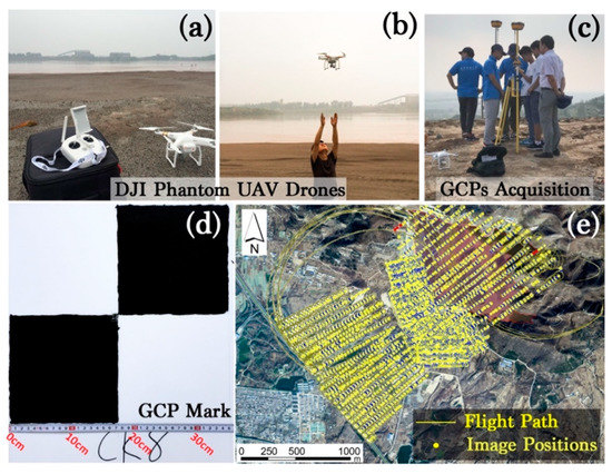 Photogrammetry data acquisition: (a,b) the DJI Phantom unmanned aerial vehicle (UAV) drones and field surveys, (c,d) ground control points (GCPs) acquisition, (e) flights implementation and images acquisition.