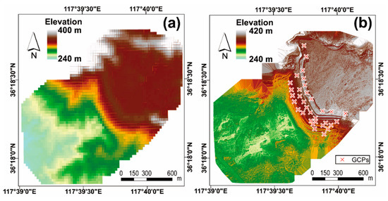 In addition, the freely available “Advanced Land Observing Satellite (ALOS) World 3D 30 m mesh” (AW3D30) dataset provided by Japan Aerospace Agency (JAXA) are extracted and illustrated in Figure 6a. The dataset was produced based on the data acquired from 2006 to 2011 by the ALOS satellite and the resolution was 1 arc second (approximately 30 m). A comparative discussion between the AW3D30 and UAV SfM DSMs is presented in Chapter 4.2.