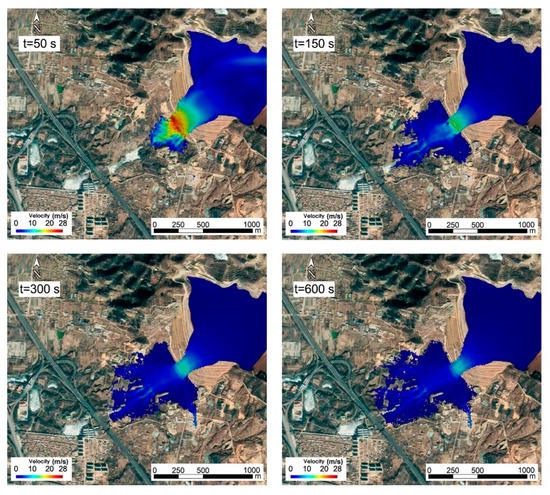 The snapshots of simulated hypothetical dam breach ROOF velocities at 50 s, 150 s, 300 s, and 600 s are presented in Figure 7. The flow velocity increased greatly at 50 s, as the gravitational potential energy of the tailings flow is swiftly transferred into kinetic energy. In addition, the velocity peak value of 22.6 m/s was identified at the dam toe. Thereafter, with the rapid decrease, the TSF capacity and the velocities of ROOF significantly reduced at 150 s, 300 s, and 600 s. The velocity peak value had reduced to less than 15 m/s at 150 s and began to impact the downstream water recovery pond. The front flow velocity was lower than 5 m/s. Thereafter, at 300 s and 600 s, the flow was spreading at less than 4 m/s over the flat area where the water recovery pond and factory plants are located in. At 600 s, a fan-shaped submerged area had formed and the front flow was approaching the G2 highway at less than 2.5 m/s. The maximum run out distance from the dam crest was measured to be 1224 m with only 78 m from the G2 highway. At 600 s, the maximum submerged depth at the low-lying water recovery pond (655 m downstream from the dam crest) was 24 m. Furthermore, the obtained submerged depth of the front flow was 4~10 m. In addition, the front flow was accumulating at several low-lying spots and several earthworks were built along the highway. Therefore, it can be inferred that the concerned G2 highway was at a safety distance from the Yujiaquan TSF, as the volume and velocity of the approaching front flow had reduced greatly, the road bed altitude was relatively higher, and the emergency response time was sufficient. However, the safety of the factory plants and workers deployed on the downstream flat area should be further considered.