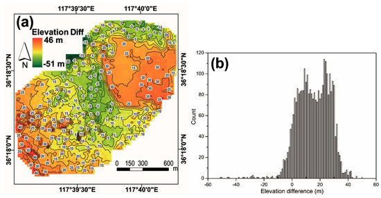 Digital surface models (DSMs) elevation differences (a) and distribution (b) between the SfM DSM and the AW3D30 DSM.