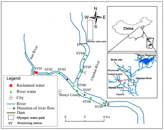 Chaobai River has been dry as a result of continual dry weather and the impoundment of the Miyun Reservoir since 1999, which belongs to the Quaternary Holocene alluvial–diluvial strata. The riverbed is mainly composed of fine sand, silt, and gravel layers. The thickness of the sand layer is generally from ten to a few dozen meters. Floodplain and terraces on both banks of the river channel are loam and sand [26]. While, Wenyu River (Figure 1) near the Chaobai River always has water flow throughout the year, which is mainly composed of domestic wastewater from surrounding communities. Wastewater in Wenyu River was treated using membrane bioreactor technology (MBR). Consequently, treated wastewater (reclaimed water) was transported to the Jian River (length: 4 km and width: 50–90 m; tributary of Chaobai River) by a water pipeline since the year 2007 [27]. Then, the Chaobai River channel from dam B to dam D was replenished by reclaimed water with a flow of 2.5 m3/s. Meanwhile, river flows freely through dam C. Most reclaimed water was stored in this section of the river as a result of the dams, except for evaporation and infiltration. The main channel of the river has a length of 7.3 km, width of 200–400 m, and average water depth of 2.5 m. River water flow was also changed by the dams after the replenishment of reclaimed water. One direction was the original river flow, i.e., southeast (to SY09), the other was northeast (to SY04; Figure 1).