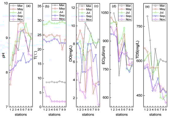 Spatial and temporal variation of pH (a), water temperature (T; b), dissolved oxygen (DO; c), electric conductivity (EC; d), and total dissolved solids (TDS; e) in the Chaobai River.