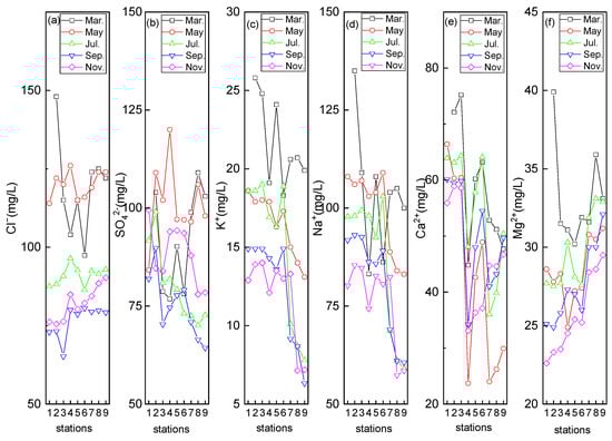 Spatial and temporal variation of Cl− (a), SO42− (b), K+ (c), Na+ (d), Ca2+ (e), and Mg2+ (f) in the Chaobai River.