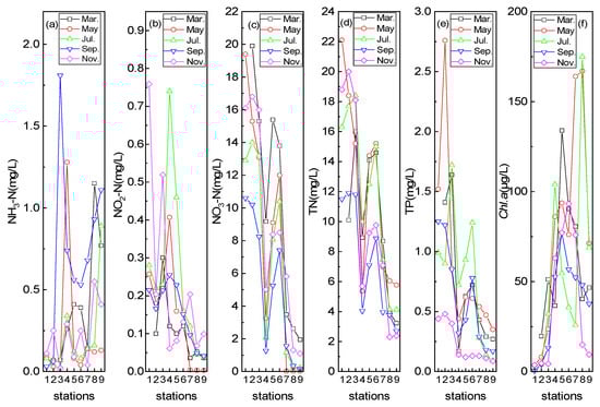 Spatial and temporal variations of nitrogen, phosphorus, and Chl.a are given in Figure 4. Spatiotemporal variation of NH3-N was obvious (Figure 4a), with the highest and the second highest value in SY01 (September) and SY04 (May), respectively. NH3-N content in May and September was higher than in other months, while most values of NH3-N were lower than 0.5 mg/L. Most NO2-N content was lower than 0.4 mg/L (Figure 4b). Generally, spatial variation of NO2-N was decreasing except for four peak values (SY01 and SY03 in November and SY04 and SY05 in July). These nitrogen forms also exhibited very high variability Rwizi River (Uganda) [58]. Gradual downward spatial variation of NO3-N, TN, and TP was apparent. The evident features of NO3-N and TN were the slight increase from SY05 to SY06 and sharp decrease in SY04. A gradual decrease was also found in the Sand River (Limpopo, South Africa) impacted by sewage effluents, and this may indicate the self-purification capacity of the river [62]. The peak value of TP was found in SY02 (May), which was higher than in reclaimed water. It may be due to the release of sediments and/or sudden external input [63,64]. While, TP in the Sand River fluctuated across the different sites [62]. First an increase and then a decrease were the feature of Chl.a spatial variation (Figure 4f). Meanwhile, it was higher downstream than upstream, with a peak value of SY08 in May (167 μg/L) and July (175 μg/L). High Chl.a was found in May and July, while a low value in November. There was a slightly low concentration of Chl.a in September corresponding to July, which may be caused by the dilution. Stations with a high peak value of Chl.a were the corresponding stations with low nitrogen and phosphorus. It further confirmed that the absorption and utilization of phytoplankton was the reason for nutrients reduction.