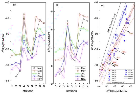 Spatiotemporal variation of δ2H (a) and δ18O (b), and their relationship (c) in the Chaobai River (GMWL (global meteoric water line) [53] and LMWL (local meteoric water line) [67] in Figure 5c were cited from published articles, respectively. Red dashed lines represent evaporation line of river water in different months).