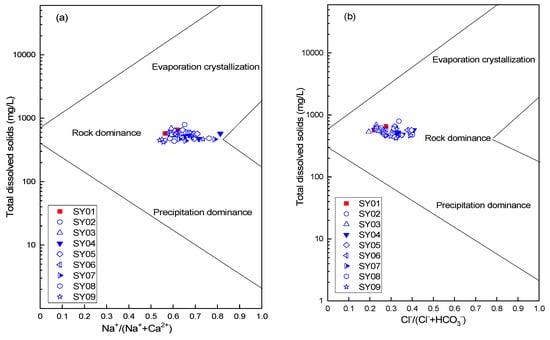 Gibbs graph of major cations (a) and anions (b) in the Chaobai River channel replenished by reclaimed water.