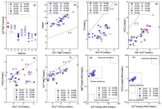 Mineral dissolution, precipitation, and redox reaction in the water environment could be inferred by the relationship of different dissolved ions in waters [13,69]. The ratio of Ca2+/Mg2+ could indicate the dissolution of carbonate minerals [69]. The ratio value was about equal to 1, indicating the dissolution of dolomite, that included SY04 (March and July), four samples in November (SY05, SY06, SY07, and SY08), SY09 (July, September, and November; Figure 7a). The value was between 1 and 2, indicating the dissolution of calcite, which included reclaimed water (SY01), river water (SY02 and SY03) river samples of SY05 (March and May) and SY06 (Figure 7a). The ratio value of the remaining samples was less than 1, showing the decrease of Ca2+, which may be caused by ion exchange. Values of Ca2++Mg2+ vs. the cation of all reclaimed water and river water samples were located above the equilibrium line (1:1; Figure 7b). It indicated that Ca2+ and Mg2+ were mainly from the dissolution of carbonate rock and calcite [18,41]. All samples of Na++K+ vs. Cl− (Figure 7c) were located below the equilibrium line, indicating that sodium and potassium ions were also affected by the dissolution of silicate minerals except the dissolution of salt rock [68]. Samples of Na++Ca2+ vs. HCO3− (Figure 7d) were all located below the equilibrium line, showing that sodium and calcium were more than bicarbonate, which indicated the dissolution of calcium-bearing minerals. Most of SO42−+Cl− vs. HCO3− were located below the equilibrium line (Figure 7e), indicating the influence of strong evaporation. Some of SO42−+HCO3− vs. Ca2++Mg2+ were located near the line (Figure 7e), indicating the dissolution of carbonate minerals [70]. While, most were below the line (Figure 7e), indicating the dissolution of the silicate mineral. The same silicate weathering location was found between the plot of Ca2++/Na+ vs. Mg2+/Na+ (Figure 7g), and plot of Ca2+/Na+ vs. HCO3−/Na+ (Figure 7h), indicating the weathering and dissolution of the silicate mineral.