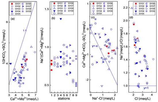 Plot of the ratio of Ca2+ + Mg2+ vs. 1/2HCO3− + SO42− (a), Na+/Ca2+ + Mg2+ (b), Na+-Cl− vs. Ca2+ + Mg2+- HCO3−-SO42− (c), and Cl− vs. Na+/Cl− (d) in all samples.