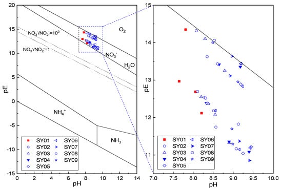 pH also played an important role in nitrogen transformation, and the double influences of pH and the redox environment could be evaluated by the pH–pE plot [78]. Therefore, samples of reclaimed water and river water were projected into Figure 10. All samples were located around the NO3− line, where the stable nitrogen form was nitrate (NO3−, +5). High DO value of reclaimed water (7.33 ± 1.75) and river water (6.20 ± 2.47) showed the oxidizing water environment, which was beneficial for nitrate stable and nitrification [78,80].