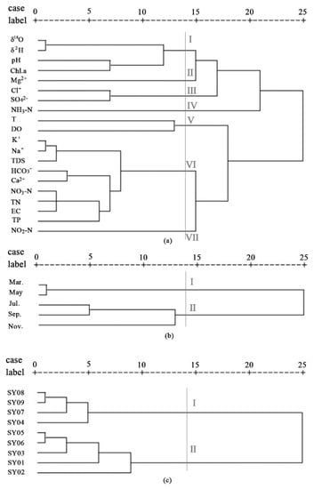 For identifying the spatiotemporal variation, the key variables should be firstly confirmed. Hence, three cluster analysis results are shown in Figure 11. In Figure 11c, twenty water chemical parameters were divided into seven clusters by the R-type cluster method for variables. Clusters were as follows. I: δ18O, δ2H, pH, and Chl.a; II: Mg2+; III: Cl−, SO42−; IV: NH3-N; V: T, DO; VI: K+, Na+, TDS, HCO3−, Ca2+, NO3-N, TN, EC, and TP; VII: NO2-N. The R2 value is calculated according to equation 1 if the quantity of parameters in one cluster was more than 2. The parameter with the highest R2 value was retained for the key parameter. The R2 value of δ18O and TDS was 0.45 and 4.80, respectively. As a result, nine parameters (δ18O, Mg2+, Cl−, SO42−, NH3-N, T, DO, TDS, and NO2-N) were selected as the key ones for further spatiotemporal cluster analysis. Five months were classified into two groups, Cluster I includes March and May, and Cluster II includes July, September, and November. These two distinct groups show the significant temporal variation. Spatial variation and similarity were analyzed by an HCA analysis (Figure 11c). All monitoring stations were classified into two groups, which include Cluster I (SY04, SY07, SY08, andSY09) and Cluster II (SY01, SY02, SY03, SY05, and SY06). Stations in Cluster II and Cluster I represent the upstream and downstream (Figure 1), respectively. The flow direction of reclaimed water along the river channel would eventually go in two directions, one was SY04 station and the other was SY09 station, because of the blocking effect of the rubber dam (Figure 1).