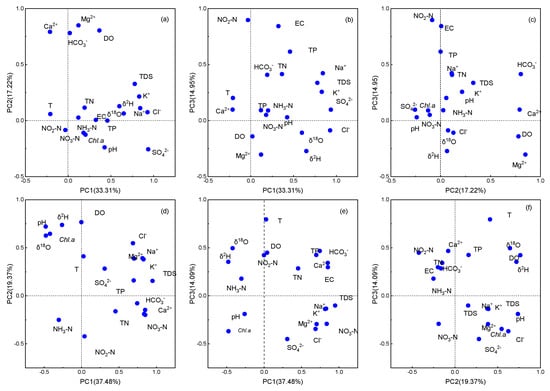 For inferring the controlling factors, two clusters were further analyzed by PCA (Table S1), and the relationship plots are given in Figure 12. The principal components would be retained according to the corresponding eigenvalue >1 [24], and the critical related parameters could be kept in terms of an explaining proportion >0.60 [25]. In Cluster I, six principal components with a total explaining 90.46% were retained. PC1 had significant and positive loading with Cl−, SO42−, K+, Na+, TDS, δ18O, and δ2H. PC2 was highly and positively related with HCO3−, Ca2+, and Mg2+. PC3 had a high and positive relation with EC, NO2-N, and TP. High and positive loading with these three components showed main water chemical composition of TDS and EC, and mineral dissolution. PC4 had high and positive loading with δ18O and δ2H. PC5 was positively related with Na+, TN, and Chl.a, while negatively related with NH3-N. PC6 was highly and positively related with NO3-N and TN. NO3-N was the main nitrogen formation formed by nitrification of NH3-N [78]. As a result, the negative loading with NH3-N could be found. Meanwhile, nitrate was also the nitrogen consumed by phytoplankton [35]. Therefore, PC5 and PC6 mainly indicated the nitrogen transformation and the photosynthesis by phytoplankton. In Cluster II, five principal components explaining 87% were retained. PC1 had high and positive loading with EC, Cl−, HCO3−, K+, Na+, Ca2+, Mg2+, and TDS, which indicated reclaimed water was the main source of major ions. Additionally, these stations were strongly impacted by reclaimed water. PC2 was highly related with Chl.a, δ18O, and δ2H. PC4 had a negative loading with SO42−. There were no highly related parameters to PC3 and PC5. High and positive loading of δ18O and δ2H, e.g., PC1, PC4 of Cluster I, and PC2 of Cluster II together showed that stable isotope compositions were controlled by reclaimed water (main water source) and strong evaporation.