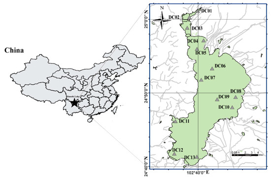 The distribution and location map of the 13 sediments sampling stations across the Dianchi Lake region. Grey lines refer to rivers. The map was created using ArcGis version 10.2.