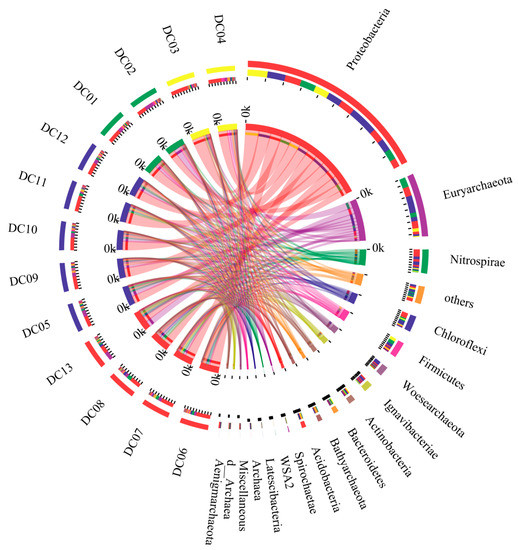 Relative abundances of dominant bacteria and archaea at the phylum level derived from sediment samples. The data were depicted with Circos. The left half circle and the right half circle indicate the taxonomic composition in respective sample and the distribution of species in different samples at the phylum level, respectively. The width of the bars complies with the relative abundance.