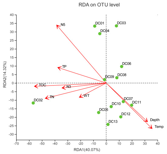 Redundancy analysis (RDA) of dominant operational taxonomic units (OTUs) as affected by sediment environmental variables. Points in the graph represent the samples. The length and angle of red arrows represent the impact of environmental factors on prokaryotic community in respective sample.