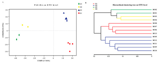 (A) Partial least square discriminant score analysis for the distance of prokaryotic communities of sediment microbiota among all the samples; (B) hierarchical clustering analysis on the similarity/diversity among the groups G1, G2, G3 and G4. Points exhibiting various colors and shapes represent different groups according to TOC level. Group G1 contained four samples (i.e., DC06, DC07, DC08, and DC13 from low TOC areas (36.1–45 g/kg)), group G2 consisted of five samples (i.e., DC05, DC09, DC10, DC11, and DC12 from moderate total organic carbon (TOC) areas (49–56.9 g/kg)), group G3 contained two samples (i.e., DC01 and DC02 from high TOC areas (87.3–131.2 g/kg)), and group G4 covered two samples (i.e., DC03 and DC04 adjacent to the dam).
