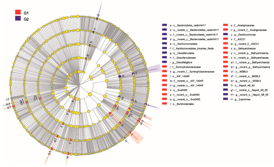 LEfSe analysis (LDA) of the bacteria and archaea inhabited in Dianchi Lake sediments exhibiting different TOC levels. Prokaryotic taxa that are differentially abundant (LDA score > 3.0) between G1 and G2 samples were visualized by Circos. Letter and number combinations indicate different taxonomic groups (from order to genus). The size of circle is proportional to the relative occurrence in respective community.