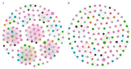 Co-occurrence patterns of phylotypes exhibiting robust pairwise correlation (ρ > 0.8, p-value < 0.01). (A) Network of group G1 with low TOC level (LT); (B) network of group G2 with moderate TOC level (MT). The nodes represent individual OTUs, and colors indicate different phyla. The pink line and the blue line represent the positive and negative correlations, respectively. The circle diameter is proportional to the mean abundance of different phyla. Colors of dots represent the species at different phylum levels.